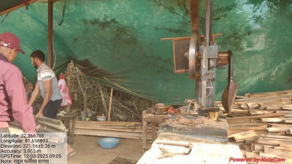 वनपरिक्षेत्र अधिकारी से मिली जानकारी अनुसार बताया गया कि वन मण्डलाधिकारी अभिनव कुमार के निर्देशन एवं एसडीओ दशांश सूर्यवंशी के दिशा निर्देश में 3 दिसम्बर बुधवार को सुबह सामान्य वन विभाग के अधिकारी व टीम ले द्वारा ग्राम सारधा में संचालित राहुल फर्नीचर मार्ट में छापामार कार्यवाही किया, जहाँ उक्त स्थान से अवैध रुप से सागौन प्रजाति के 11 नग लठ्ठा -1.394 घनमीटर एवं आरा मशीन को जप्त पीआरओ 19214/6 को जारी कर जप्तीकर काष्ठ चिरान अधिनियम 1984 के अन्तर्गत कार्यवाही किया। फर्नीचर मशीन को सील किया गया।