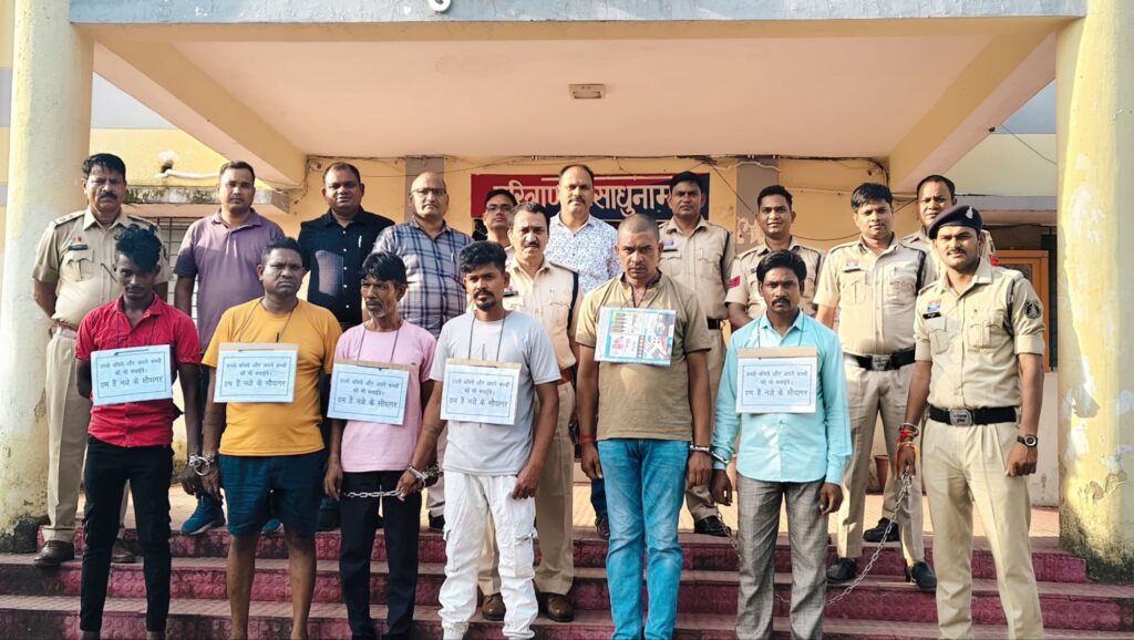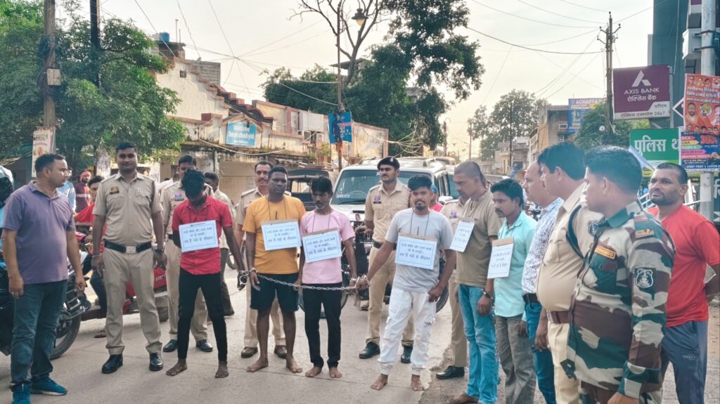 दिनांक 18 अगस्त को मुंगेली पुलिस अधीक्षक भोजराम पटेल के निर्देशन मे थाना सिटी कोतवाली, थाना जरहागांव एवं सायबर सेल के द्वारा संयुक्त रूप से टीम गठित कर जिले मे अवैध रूप से मादक पदार्थ ब्राउन शुगर, गांजा एवं अन्य नशे का तस्करी कर युवा पीढ़ी को नशे का लत लगाने वाले ऐसे तस्करों तथा ब्रिकी करने वाले लोगो की सूची तैयार कर थाना मुंगेली क्षेत्रान्तर्गत 1. जाकिर खान पिता जब्बार खान निवासी दाउपारा चौक मुंगेली 2. सोनू डांडे उर्फ छोटे सोनू पिता स्व. किशोर मेहर डाण्डे उम्र 32 वर्ष निवासी वार्ड 17 केशवपुर मुंगेली 3. अनिल कुमार खरसायन उर्फ बड़े सोनू पिता जनक राम मेहर उम्र 38 वर्ष निवासी वार्ड 17 केशवपुर मुंगेली 4. विष्णु वैष्णव उर्फ शिव बाबा पिता बृजभूषण वैष्णव उम्र 58 वर्ष निवासी खर्रीपारा मुंगेली व थाना जरहागांव क्षेत्रान्तर्गत 6. किशोर ध्रुव पिता स्व.राजेन्द्र प्रसाद उम्र 35 वर्ष निवासी झझपुरी खुर्द जरहागांव 7. अमित साहू पिता बाबुराम उम्र 38 वर्ष निवासी झझपुरी खुर्द जरहागांव को हिरासत मे लेकर पुछताछ किया गया जो पृथक-पृथक नशा ब्राउन शुगर, नाइट्रा, गांजा, सिगरेट, बीड़ी, शराब का सेवन तथा बाहर राज्यों से ब्राउन शुगर को लाकर युवाओं को बेचते है तथा नशा कराते है जिस पर उक्त जाकिर खान, सोनू डांडे, अनिल खरसायन, विष्णु वैण्णव, किशोर धु्रव, अमित साहू की गिरफ्तारी कर शहर मे रैली जुलुस निकालकर तस्करों तथा ब्रिकी करने वालों को ‘‘हम है नशा के सौदागर, हमसे बचिये और अपने बच्चों को भी बचाईये’’ का नारा लगवाते हुये पुरे शहर मे पैदल घुमाया गया और युवा पीढ़ियो को जागरूक किया गया और प्रतिबंधात्मक कार्यवाही के तहत जेल दाखिल किया गया।