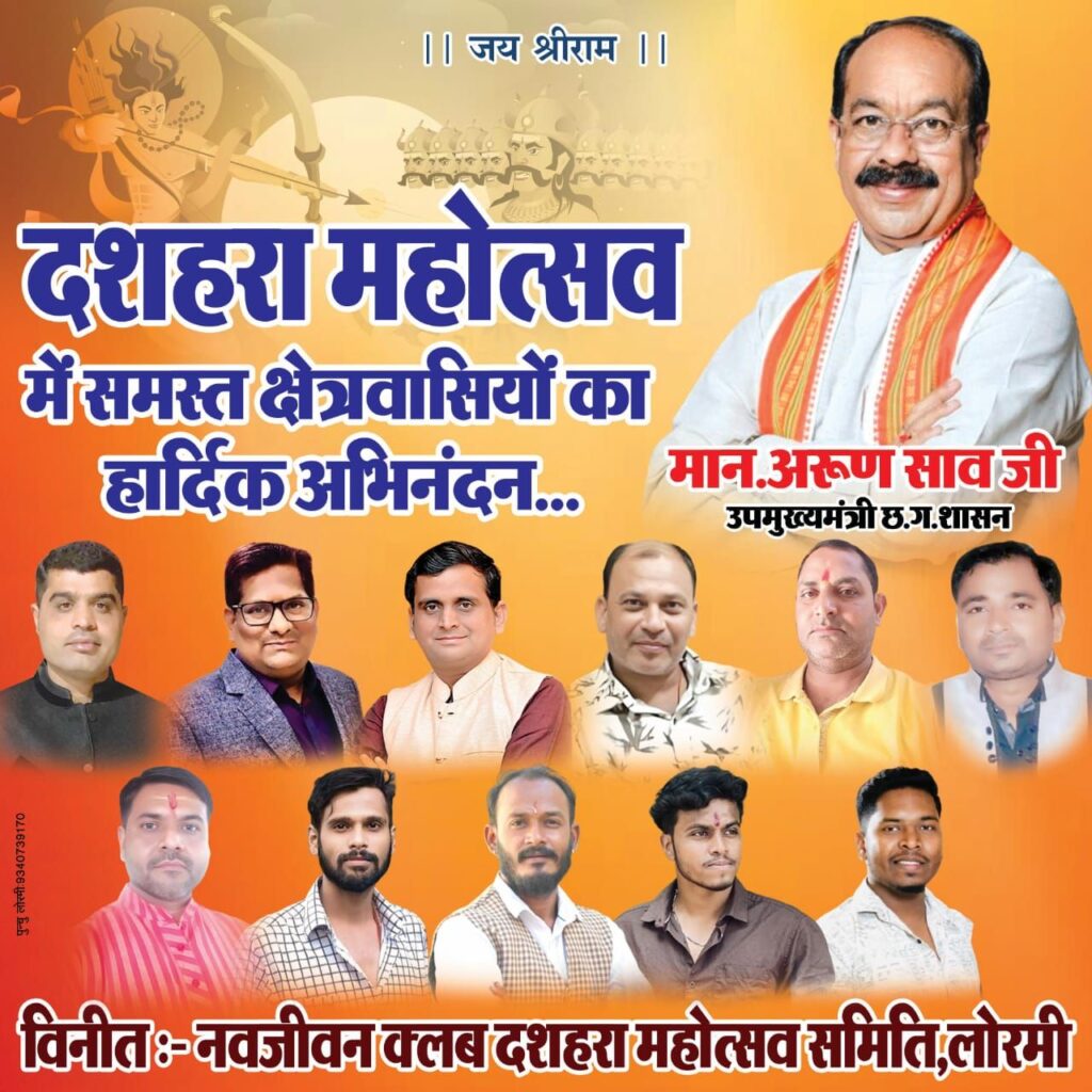 नवजीवन क्लब दशहरा महोत्सव में रावण दहन कार्यक्रम में प्रदेश के डिप्टी सीएम व विधायक अरुण साव रात्रि 7 बजे हाईस्कूल के मैदान के मैदान पहुँचनेगे श्री साव जी के बड़ी पानी टँकी, वार्ड 6 के पार्षद विश्वास दुबे के निवास के पास मंच में पहुँचकर सभी का अभिवादन करेंगे। आयोजन समिति के प्रमुख नरेन्द्र खत्री ने बताया कि समिति के द्वारा आकर्षक झांकी के साथ श्री राम, लक्ष्मण, सीता, हनुमान व रावण, जीवंत झांकीयों के साथ श्री राम की जय जयकारों के साथ राजाबाड़ा से निकलकर पूरे नगर का भ्रमण करते हुए हाईस्कूल के मैदान में 31 फीट रावण का विधि विधान के साथ दहन किया जाएगा।
