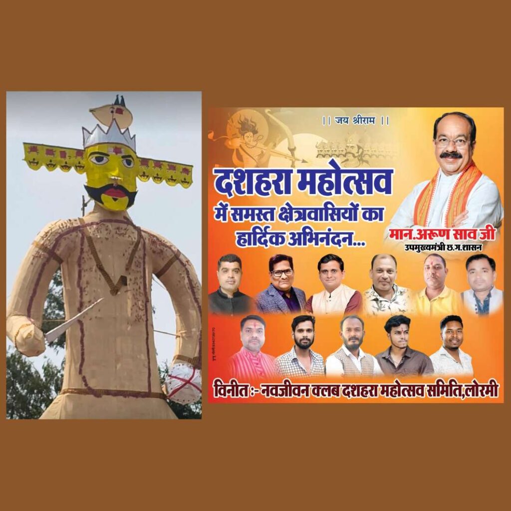 नवजीवन क्लब दशहरा महोत्सव में रावण दहन कार्यक्रम में प्रदेश के डिप्टी सीएम व विधायक अरुण साव रात्रि 7 बजे हाईस्कूल के मैदान के मैदान पहुँचनेगे श्री साव जी के बड़ी पानी टँकी, वार्ड 6 के पार्षद विश्वास दुबे के निवास के पास मंच में पहुँचकर सभी का अभिवादन करेंगे। आयोजन समिति के प्रमुख नरेन्द्र खत्री ने बताया कि समिति के द्वारा आकर्षक झांकी के साथ श्री राम, लक्ष्मण, सीता, हनुमान व रावण, जीवंत झांकीयों के साथ श्री राम की जय जयकारों के साथ राजाबाड़ा से निकलकर पूरे नगर का भ्रमण करते हुए हाईस्कूल के मैदान में 31 फीट रावण का विधि विधान के साथ दहन किया जाएगा।