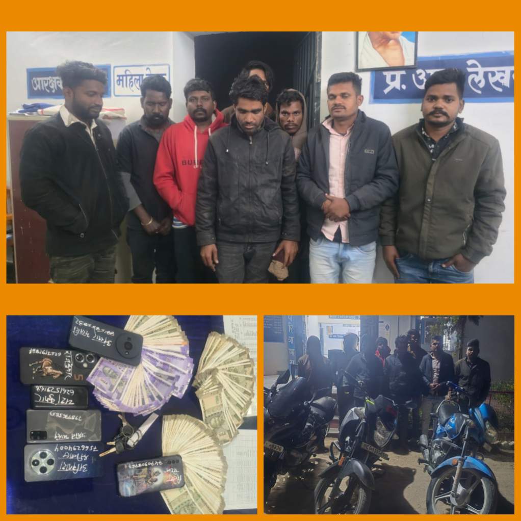 विवरणः- प्रहार अभियान के तहत अवैध कार्यं पर पुर्ण अंकुश लगाने हेत वरिष्ठ पुलिस अधीक्षक रजनेश सिंह (आईपीएस) के निर्देशो के परिपालन में आज दिनाक 31.12.2025 को अतिरिक्त पुलिस अधीक्षक ग्रामीण डॉ अर्चना झा, अनुविभागीय पुलिस अधिकारी श्रीमती नुपुर उपाध्याय के दिशा निर्देशन पर बेलगहना पुलिस के द्वारा आज शाम बगघरा जंगल में रेड कार्यवाही कर घने जंगलों के बीच ताश से काट पत्ती नाम जूआ खेल रहे 08 ज्आडियान