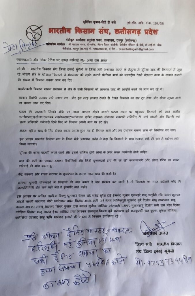 खाद की कमी का फायदा उठाकर बिचौलियों और निजी दुकानदारों द्वारा की जा रही कालाबाजारी और ओवर रेटिंग पर सख्त कार्रवाई की मांग करता हूं ।