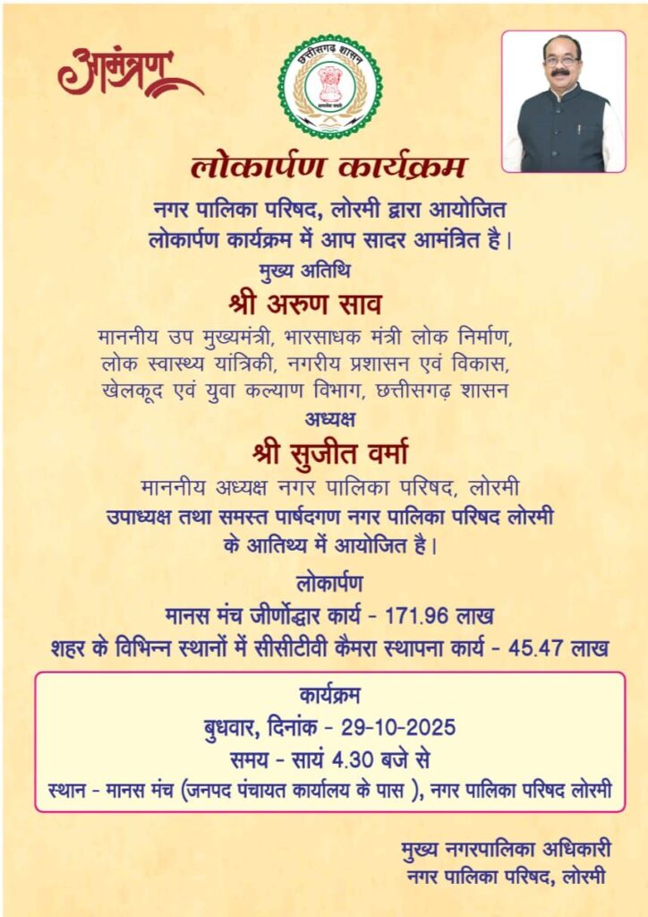 मानस मंच के सौंदर्यीकरण का लोकार्पण 29 अक्टूबर को शाम 4 बजे किया जाएगा, इसके लिए स्थानीय विधायक एवं उपमुख्यमंत्री अरुण साव ने सभी सनातनी प्रेमियों को आमंत्रित किया है, उपमुख्यमंत्री अरुण साव ने कहा कि यह मानस मंच लोरमी की आन बान शान और गौरव को बढ़ाने वाला है, एक करोड़ 75 लाख की लागत से तैयार यह मानस मंच अयोध्या की तरह भव्य और दिव्य दिखाई दे रहा है इसके लोकार्पण के ऐतिहासिक अवसर पर आप सभी मानस मंडली राम भक्त जन और सनातन प्रेमी साक्षी बने।