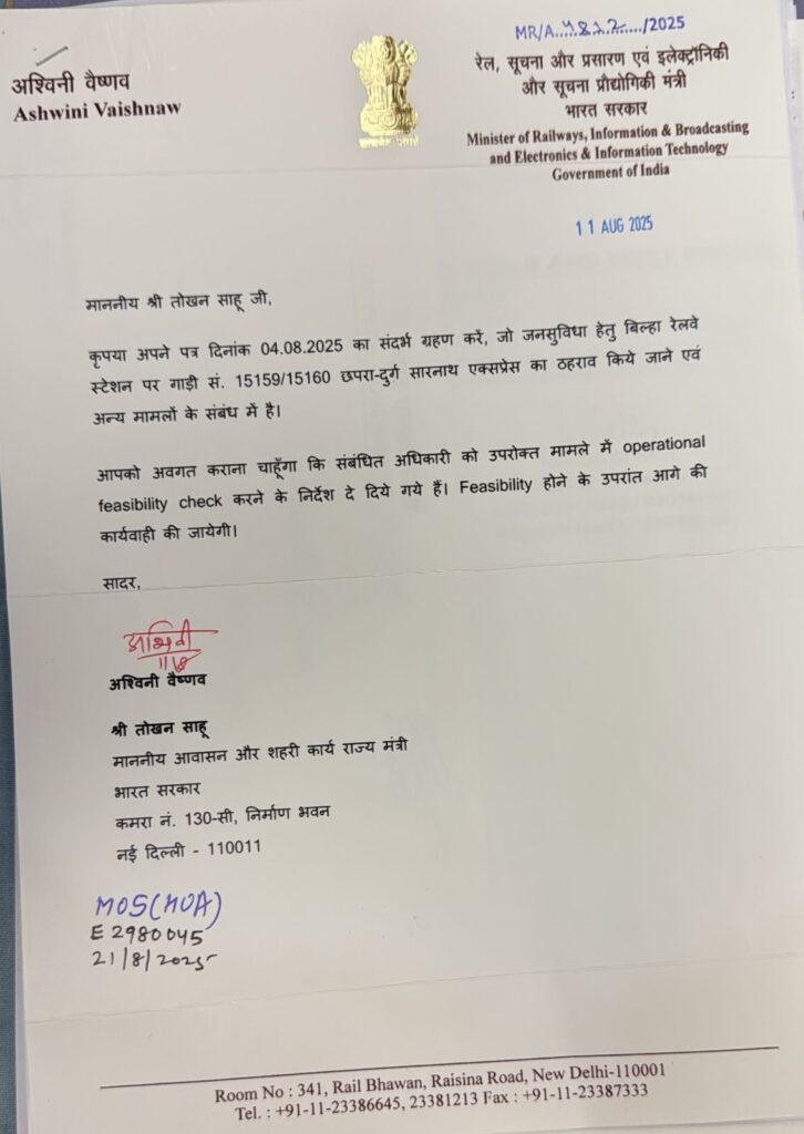 बिलासपुर/– बिल्हा क्षेत्र के रेलयात्रियों के लिए खुशखबरी- केन्द्रीय राज्यमंत्री तोखन साहू की पहल पर केन्द्रीय रेल मंत्री अश्विनी वैष्णव ने ट्रेन ठहराव के लिए अधिकारियों को निर्देश दिए