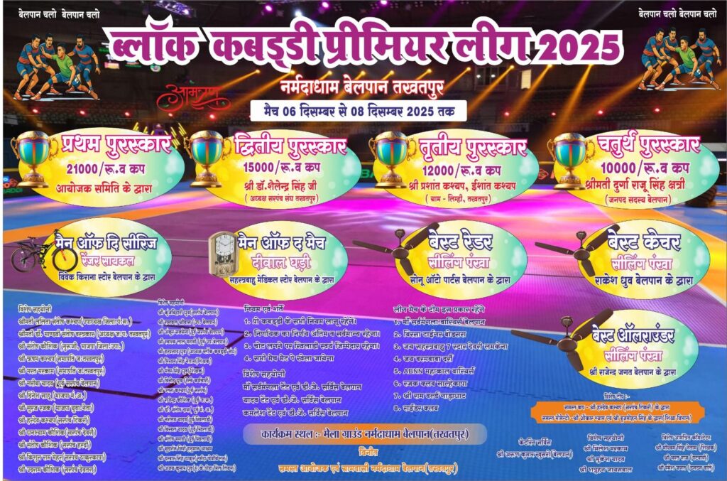 धर्मनगरी बेलपान में ब्लॉक स्तरीय कबड्डी प्रीमियर लीग 2025 का भव्य अयोजन