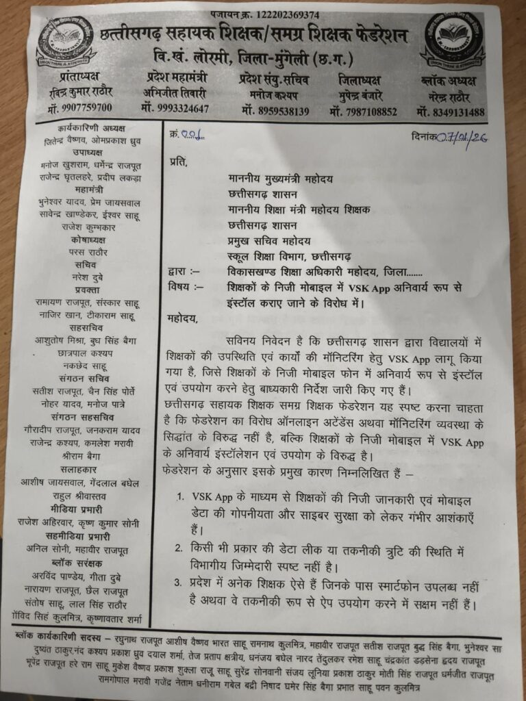 लोरमी: सहायक शिक्षक फेडरेशन ब्लॉक इकाई लोरमी द्वारा विकास खंड शिक्षा अधिकारी लोरमी को प्रांतीय महामंत्री अभिजीत तिवारी एवं ब्लॉक अध्यक्ष नरेंद्र राठौर के नेतृत्व में राज्य शासन शिक्षा विभाग द्वारा विद्यालयों में शिक्षकों की उपस्थिति सुनिश्चित कराने हेतु उनके स्वयं के मोबाइल फोन पर वी एस के ऐप डाउनलोड कराकर स्वयं की उपस्थिति दर्ज करने के विरोध में मुख्यमंत्री एवं शिक्षा मंत्री के नाम से ज्ञापन सौंपा गया एवं सर्विस बुक संधारण,जी पी एस पासबुक संधारण,सामाजिक आर्थिक सर्वेक्षण कार्य के दिवसों को अर्जित अवकाश के रूप में संबंधित शिक्षकों के सर्विस बुक में संधारण करने,शिक्षकों द्वारा वांछित अर्जित अवकाश,चिकित्सा अवकाश एवं अन्य अवकाशों के संबंध में ऑनलाइन एवं ऑफलाइन गतिविधियों पर पारदर्शिता के साथ विकास खंड शिक्षा कार्यालय की गतिविधियों को संचालित कराने के संबंध में एवं विकास खंड शिक्षा अधिकारी श्रीमती मनीषा पाटले मैडम जी से शिक्षक हित संबंधित सभी मुद्दों पर सकारात्मक चर्चा भी हुई।