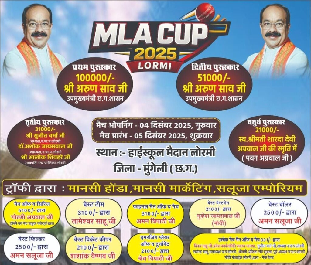 नगर के हाई स्कूल मैदान में आईपीएल की तर्ज में एम एल ए कप 2025 का आयोजन किया जा रहा, जिसमे 16 टीमो ने हिस्सा लिया है सभी टीमो का लोरमी नगरपालिका अध्यक्ष सुजीत वर्मा, वरिष्ट भाजपा नेता राकेश दुबे, विनय साहू, पार्षद रिक्की सलुजा, घनश्याम यादव, शशांक वैष्णव, धनन्जय दुबे, मनोज निषाद, पत्रकार जितेन्द्र पाठक के द्वारा सभी टीमो का जर्सी लांच कर एम एल ए कप 2025 का शुभारंभ किया गया। तत्पश्चात पत्रकार इलेवन व नगर पालिका इलेवन के बीच सद्भावना मैच 6-6 ओवर का खेला गया पत्रकार इलेवन के कप्तान जितेन्द्र पाठक ने टॉस जीतकर पहले बैटिंग का फैसला लिया पहले बल्लेबाजी करते हुए ओपनिग जोड़ी आकाश सलुजा व समीर पाठक ने शानदार बल्लेबाजी टीम को अच्छी शुरुवात दिए, दूसरे क्रम में बल्लेबाजी करने आये कप्तान जितेन्द्र पाठक ने नाबाद 10 रन बनाए टीम के बल्लेबाज राहुल यादव, निशांत कश्यप, का सराहनीय योगदान रहा पत्रकार इलेवन ने 6 ओवर में 5 विकेट पर 38 रन बनाए। पार्षद रिक्की सलुजा ने गेंदबाजी में शानदार प्रदर्शन करते हुए 3 विकेट लिए। रनों का पीछा करने उतरी नपा इलेवन 6 ओवर में 30 रन बना सकी नपा अध्यक्ष सुजीत वर्मा ने 12 रन बनाए। पार्षद शशांक वैष्णव, धनन्जय दुबे, कृष्ण कुमार निषाद का भी प्रदर्शन सराहनीय रहा। पत्रकार इलवेन ने 8 रनों से मैच जीत अर्जित किया। मैच के दौरान नूतन गुप्ता, नीरज अग्रवाल, प्रमोद जायसवाल सहित आयोजन समिति के विराग शुक्ला, श्रेय त्रिपाठी, अवध त्रिपाठी, चंदन मौर्य, सागर रजक, मोनू ठाकुर, अभिषेक कश्यप, अंशुमान दुबे, मुजीब खान, भूपेन्द्र वैष्णव, सोमू परिहार, जित्तू सारथी, प्रमोद, सुमन, अशोक कश्यप, स्वतंत्र कश्यप, राहुल बुनकर आदि खिलाड़ी आयोजन को सफल बनाने में लगे हुए है। मैच का प्रथम पुरुस्कार 1 लाख रुपये नगद व द्वितीय पुरुस्कार 51 हजार रुपये डिप्टी सीएम व विधायक अरुण साव के द्वारा प्रदान किया जाएगा, तृतीय पुरुस्कार 31 हजार रुपये नपा अध्यक्ष सुजीत वर्मा, उपाध्यक्ष डॉ अशोक जायसवाल, सभापति अलोक शिवहरे के द्वारा, चतुर्थ पुरुस्कार 21 हजार रुपये स्व शारदा देवी की स्मृति में पवन अग्रवाल के द्वारा साथ मे ट्राफी मानसी होंडा, मानसी मार्केटिंग, सुजला एम्पोरियम के द्वारा प्रदान किया जाएगा। मैन आफ द सीरीज 51 सौ रुपये व ट्राफी गोल्डी अग्रवाल व बेट राहुल स्पोर्ट्स द्वारा, बेस्ट टीम 31 सौ रुपये तामेश्वर साहु, फायनल मैन आफ द मैच 31 सौ रुपये अमन त्रिपाठी, बेस्ट बॉलर, बेस्ट फील्डर 25-25 सौ रुपये अमन सलुजा, बेस्ट बेस्ट बेस्टमेन 21 सौ रुपये मुकेश जायसवाल (मोदी), बेस्ट कीपर 21 सौ रुपये शशांक वैष्णव, इमरजिंग प्लेयर आफ द टूर्नामेंट 21 सौ रुपये श्रेय त्रिपाठी, प्रत्येक मैन आफ द मैच 301 रुपये विनय साहू प्रदेश कार्य समिति सदस्य भाजपा, नपा अध्यक्ष सुजीत वर्मा, जप उपाध्