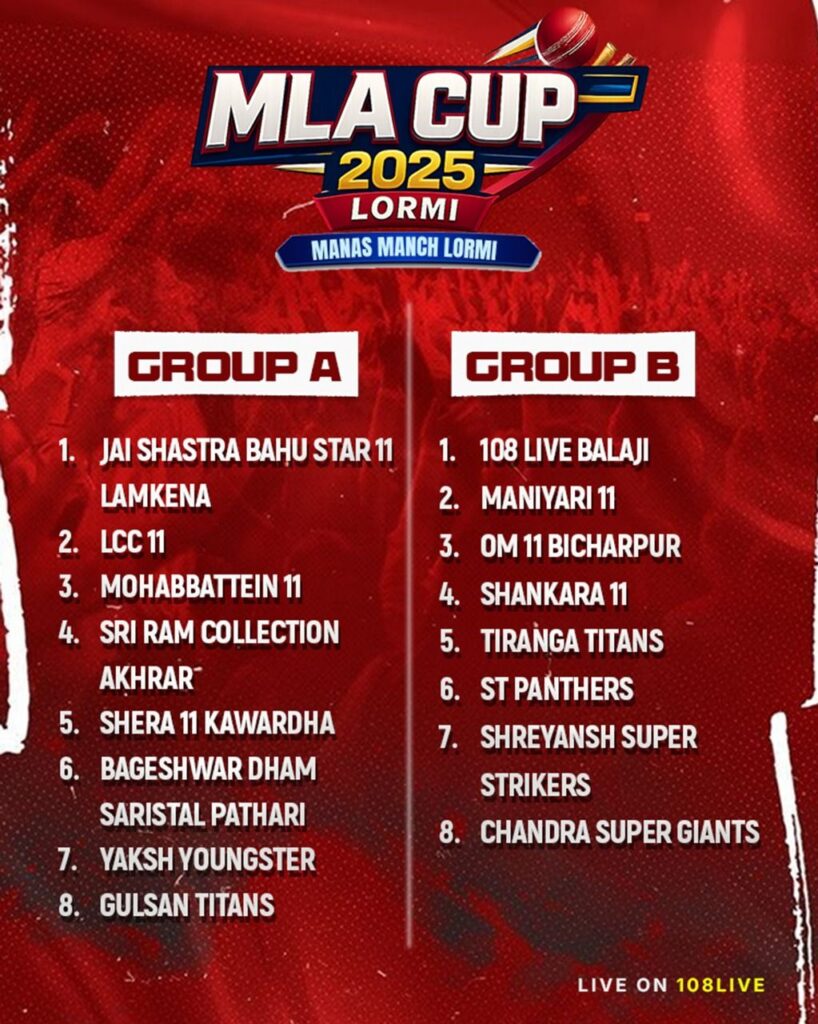 एम एल ए कप 2025 में 16 टीम अपना प्रदर्शन दिखाएंगे पूरा मैच आईपीएल के तर्ज में हो रहा सभी टीमो को दो ग्रुप 8-8 में बांटा गया है सभी टीम कुल लगभग 7 मैच खेलेंगे। टीम ए ग्रुप में जय सहस्त्र बाहु स्टार इलेवन लमकेना, एल सी सी इलवेन, मोहब्बते इलेवन, श्री राम कलेक्शन अखरार, शेरा इलवेन कवर्धा, बागेश्वर धाम सारिसताल पठारी, यक्ष यंगस्टार, गुलशन टाइटन्स को रखा गया है। ग्रुप बी में 108 लाइव बालाजी, मनियारी इलेवन, ओम इलवेन बिचारपुर, शंकरा इलवेन, तिरंगा टाइटन्स, एस टी पैंथर्स, श्रेयांस सुपर स्ट्राइकर, चंद्रा सुपर जॉइंट अपना जौहर दिखाएंगे