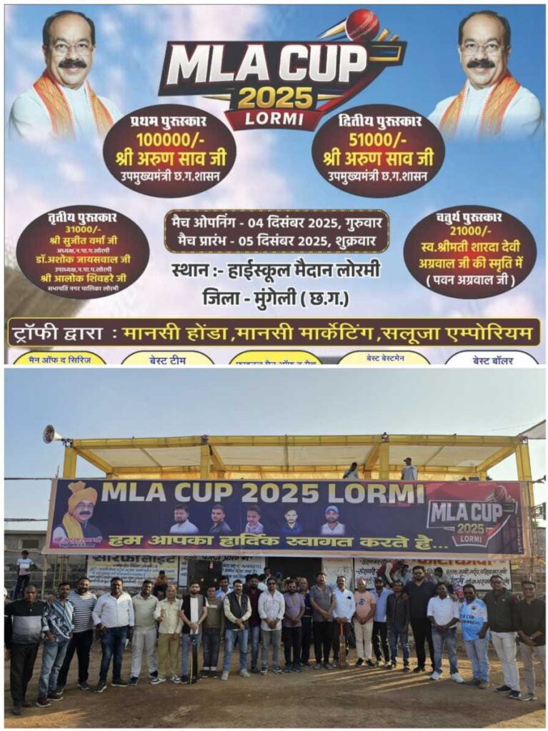 नगर के हाई स्कूल मैदान में आईपीएल की तर्ज में एम एल ए कप 2025 का आयोजन किया जा रहा, जिसमे 16 टीमो ने हिस्सा लिया है सभी टीमो का लोरमी नगरपालिका अध्यक्ष सुजीत वर्मा, वरिष्ट भाजपा नेता राकेश दुबे, विनय साहू, पार्षद रिक्की सलुजा, घनश्याम यादव, शशांक वैष्णव, धनन्जय दुबे, मनोज निषाद, पत्रकार जितेन्द्र पाठक के द्वारा सभी टीमो का जर्सी लांच कर एम एल ए कप 2025 का शुभारंभ किया गया। तत्पश्चात पत्रकार इलेवन व नगर पालिका इलेवन के बीच सद्भावना मैच 6-6 ओवर का खेला गया पत्रकार इलेवन के कप्तान जितेन्द्र पाठक ने टॉस जीतकर पहले बैटिंग का फैसला लिया पहले बल्लेबाजी करते हुए ओपनिग जोड़ी आकाश सलुजा व समीर पाठक ने शानदार बल्लेबाजी टीम को अच्छी शुरुवात दिए, दूसरे क्रम में बल्लेबाजी करने आये कप्तान जितेन्द्र पाठक ने नाबाद 10 रन बनाए टीम के बल्लेबाज राहुल यादव, निशांत कश्यप, का सराहनीय योगदान रहा पत्रकार इलेवन ने 6 ओवर में 5 विकेट पर 38 रन बनाए। पार्षद रिक्की सलुजा ने गेंदबाजी में शानदार प्रदर्शन करते हुए 3 विकेट लिए। रनों का पीछा करने उतरी नपा इलेवन 6 ओवर में 30 रन बना सकी नपा अध्यक्ष सुजीत वर्मा ने 12 रन बनाए। पार्षद शशांक वैष्णव, धनन्जय दुबे, कृष्ण कुमार निषाद का भी प्रदर्शन सराहनीय रहा। पत्रकार इलवेन ने 8 रनों से मैच जीत अर्जित किया। मैच के दौरान नूतन गुप्ता, नीरज अग्रवाल, प्रमोद जायसवाल सहित आयोजन समिति के विराग शुक्ला, श्रेय त्रिपाठी, अवध त्रिपाठी, चंदन मौर्य, सागर रजक, मोनू ठाकुर, अभिषेक कश्यप, अंशुमान दुबे, मुजीब खान, भूपेन्द्र वैष्णव, सोमू परिहार, जित्तू सारथी, प्रमोद, सुमन, अशोक कश्यप, स्वतंत्र कश्यप, राहुल बुनकर आदि खिलाड़ी आयोजन को सफल बनाने में लगे हुए है। मैच का प्रथम पुरुस्कार 1 लाख रुपये नगद व द्वितीय पुरुस्कार 51 हजार रुपये डिप्टी सीएम व विधायक अरुण साव के द्वारा प्रदान किया जाएगा, तृतीय पुरुस्कार 31 हजार रुपये नपा अध्यक्ष सुजीत वर्मा, उपाध्यक्ष डॉ अशोक जायसवाल, सभापति अलोक शिवहरे के द्वारा, चतुर्थ पुरुस्कार 21 हजार रुपये स्व शारदा देवी की स्मृति में पवन अग्रवाल के द्वारा साथ मे ट्राफी मानसी होंडा, मानसी मार्केटिंग, सुजला एम्पोरियम के द्वारा प्रदान किया जाएगा। मैन आफ द सीरीज 51 सौ रुपये व ट्राफी गोल्डी अग्रवाल व बेट राहुल स्पोर्ट्स द्वारा, बेस्ट टीम 31 सौ रुपये तामेश्वर साहु, फायनल मैन आफ द मैच 31 सौ रुपये अमन त्रिपाठी, बेस्ट बॉलर, बेस्ट फील्डर 25-25 सौ रुपये अमन सलुजा, बेस्ट बेस्ट बेस्टमेन 21 सौ रुपये मुकेश जायसवाल (मोदी), बेस्ट कीपर 21 सौ रुपये शशांक वैष्णव, इमरजिंग प्लेयर आफ द टूर्नामेंट 21 सौ रुपये श्रेय त्रिपाठी, प्रत्येक मैन आफ द मैच 301 रुपये विनय साहू प्रदेश कार्य समिति सदस्य भाजपा, नपा अध्यक्ष सुजीत वर्मा, जप उपाध्