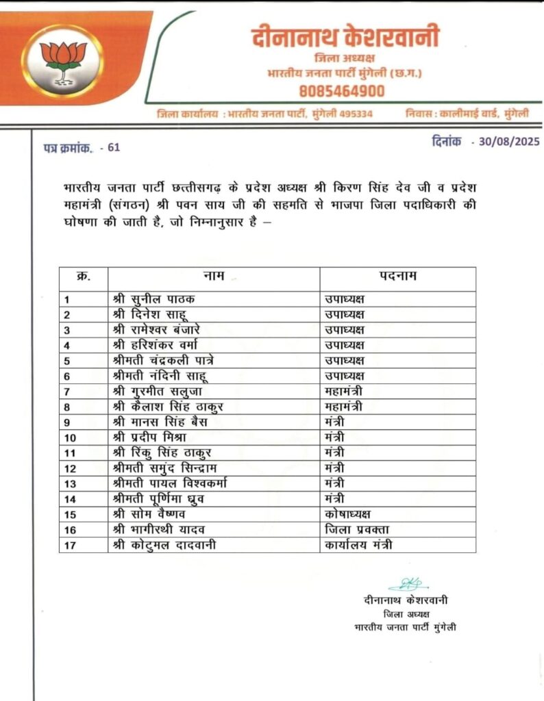 मुंगेली – भारतीय जनता पार्टी प्रदेश अध्यक्ष किरण सिंह देव व प्रदेश महामंत्री संगठन पवन साय की सहमति से जिलाध्यक्ष दीनानाथ केशरवानी ने जिला पदाधिकारियों की घोषणा की।