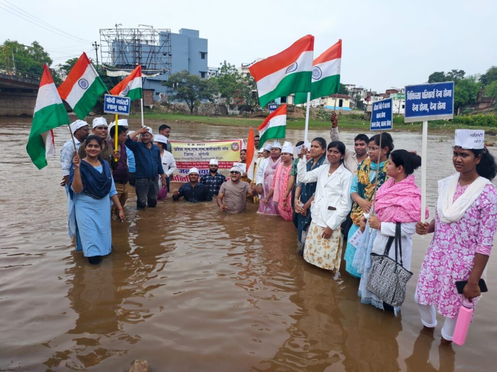 एनएचएम संविदा कर्मचारियों ने किया पुलघाट आगर नदी पर किया जल सत्याग्रह