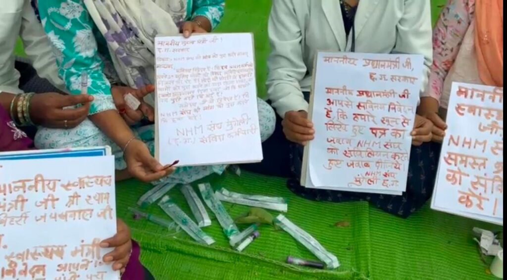 मुंगेली- छत्तीसगढ़ प्रदेश एनएचएम संघ के आव्हान पर जिले में राष्ट्रीय स्वास्थ्य मिशन (एनएचएम) के कर्मचारियों ने अपनी मांगों को लेकर अनिश्चितकालीन हड़ताल पर है, हड़ताल स्थल पर कर्मचारियों द्वारा अनोखा प्रदर्शन की जा रही है कर्मचारियों द्वारा आज खून से पत्र लिखकर प्रधानमंत्री, केंद्रीय मंत्री, केंद्रीय स्वास्थ्य मंत्री, मुख्यमंत्री, स्वास्थ्य मंत्री अपनी नाराजगी जाहिर की गई! इसके पहले हाथो मे मेहंदी लगाकर प्रदर्शन किया गया था! कर्मचारियों के हड़ताल मे जाने से स्वास्थ्य सेवा प्रभावित हो रही है! सरकार से सम्मानजनक सेवा शर्तों और स्थायित्व के साथ-साथ समान वेतन और नियमितीकरण की मांग कर रहे हैं।