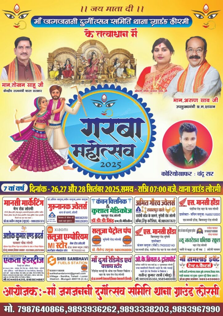 नवरात्रि के अवसर पर तीन दिवसीय थाना ग्राउण्ड में गरबा, डांडिया का आयोजन, उपमुख्यमंत्री अरूण साव सपत्नि होगे शामिल, 26 को किया जायेगा शुभारंभ