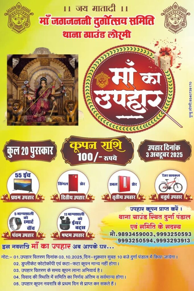 माॅ जगजननी दुर्गोत्सव समिति के द्वारा लक्की ड्रा का किया जा रहा है आयोजन