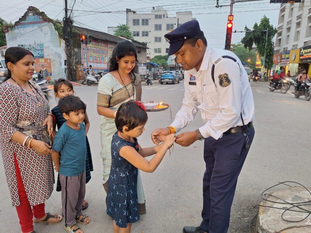 त्यौहार के दौरान रोड में यातायात व्यवस्था संभालतेट्रैफ़िक के जवानों को भी राखी बाँध कर मनाया रक्षाबंधन कापर्व