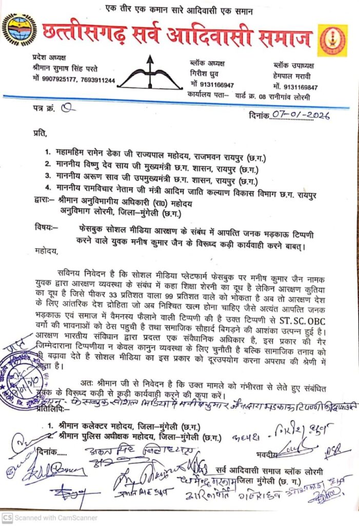 ज्ञापन में आदिवासी समाज ने उल्लेख किया है, की सोशल मीडिया प्लेटफार्म फेसबुक पर मनीष कुमार जैन नामक युवक द्वारा आरक्षण व्यवस्था के संबंध में कहा शिक्षा शेरनी का दूध है, लेकिन आरक्षण कुतिया का दूध है, जिसे पीकर 33 प्रतिशत वाला 99 प्रतिशत वाले को भोकता है, अब तो आरक्षण देश के लिए आंतरिक देश द्रोहिता जो अब निश्चित खत्म होना चाहिए जैसे अत्यंत आपत्ति जनक भड़काऊ एवं समाज में वैमनस्य फैलाने वाली टिप्पणी की है।