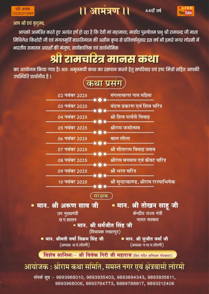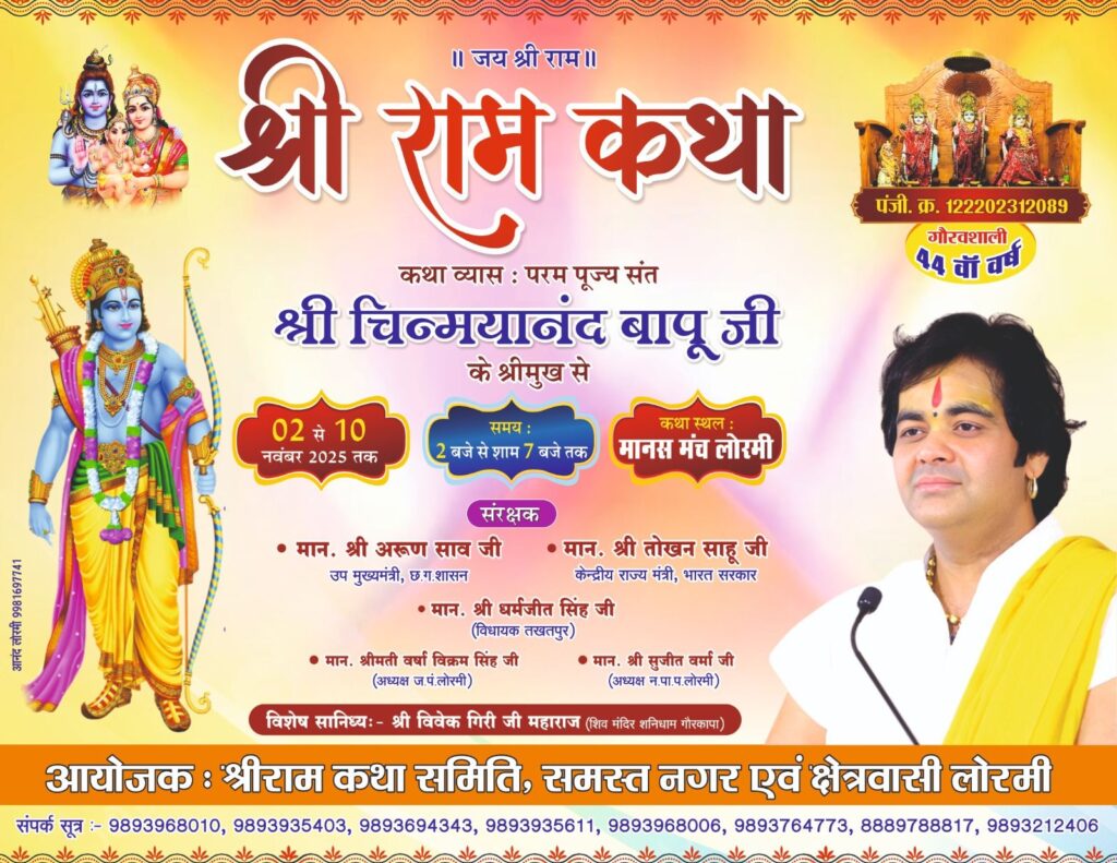 लोरमी – नगर में प्रतिवर्ष की भांति इस वर्ष भी नगर के ह्र्दय स्थल मानस मंच में अखिल भारतीय श्रीराम कथा समिति के द्वारा 2 नवंबर से 10 नवम्बर तक नव दिवसीय श्रीराम कथा का 44 वी वर्ष का आयोजन किया जाना है जिसमें विश्व विख्यात संत चिन्मयानंद बापू के श्रीमुख से श्रीराम कथा होगी, कथा वाचक के द्वारा भगवान श्रीराम के जीवन गाथा पर आधारित विभिन्न कथा का रसपान कराया जाएगा, इस ऐतिहासिक आयोजन को लेकर मानस मंच समिति के द्वारा पूरी तैयारियां कर लिया गया । जिसमें केंद्रीय राज्य मंत्री तोखन साहू एवं उपमुख्यमंत्री अरुण साव सपत्नीक उपस्थित रहेंगे। कथा प्रारंभ के पूर्व भव्य शोभायात्रा सुबह 11 बजे श्रीराम जानकी मंदिर से मानस मंच तक निकाला जाएगा । श्रीराम कथा समिति के समस्त पदाधिकारी और सदस्यगण आयोजन को लेकर जुटे हुए हैं।