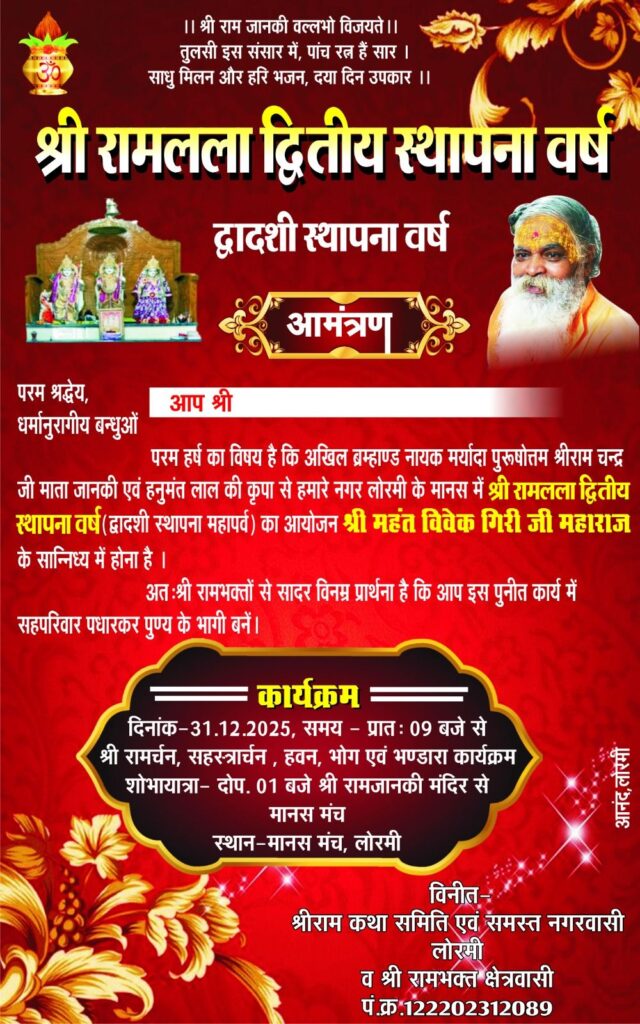 लोरमी – लोरमी नगर में मानस मंच में श्रीरामलला द्वितीय स्थापना (द्वादशी स्थापना महोत्सव) का आयोजन मं. विवेक गिरी जी महाराज के सानिध्य में दिनांक 31 दिसम्बर बुधवार मानस मंच में आयोजित किया जाएगा, सुबह 9 बजे से श्रीरामर्चन, सहस्त्राचर्न, हवन भोग भंडारा का आयोजन किया जाएगा इस अवसर पर नगर के श्रीरामजानकी मंदिर से मानस मंच तक दोपहर 1 बजे शोभायात्रा निकाला जाएगा। आयोजन को सफल बनाने के लिए श्रीराम कथा समिति एवं श्रीराम भक्तगण तैयारी में जुटे हुए है।