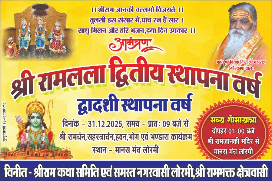 लोरमी – लोरमी नगर में मानस मंच में श्रीरामलला द्वितीय स्थापना (द्वादशी स्थापना महोत्सव) का आयोजन मं. विवेक गिरी जी महाराज के सानिध्य में दिनांक 31 दिसम्बर बुधवार मानस मंच में आयोजित किया जाएगा, सुबह 9 बजे से श्रीरामर्चन, सहस्त्राचर्न, हवन भोग भंडारा का आयोजन किया जाएगा इस अवसर पर नगर के श्रीरामजानकी मंदिर से मानस मंच तक दोपहर 1 बजे शोभायात्रा निकाला जाएगा। आयोजन को सफल बनाने के लिए श्रीराम कथा समिति एवं श्रीराम भक्तगण तैयारी में जुटे हुए है।