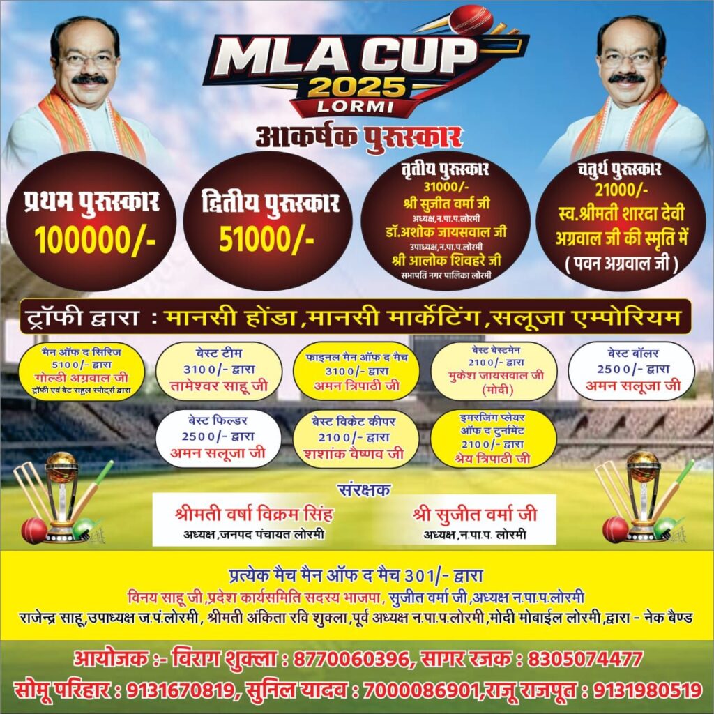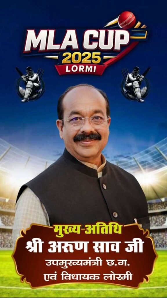 लोरमी – लोरमी नगर के हाईस्कूल मैदान में आईपीएल की तर्ज पर एमएलए कप क्रिकेट प्रतियोगिता 2025 का शानदार आयोजन किया जा रहा है जिसका फायनल मुकाबला 21 दिसम्बर रविवार को 12 बजे खेला जाएगा। क्रिकेट प्रतियोगिता में 16 फ्रेंचाइजी के द्वारा टीमो को उतारा गया। मुख्य अतिथि के रूप में उपमुख्यमंत्री व विधायक अरुण साव, विशिष्ट अतिथि सुश्री संजू देवी भारतीय महिला कबड्डी खिलाड़ी विश्व विजेता उपस्थित रहेंगे।
